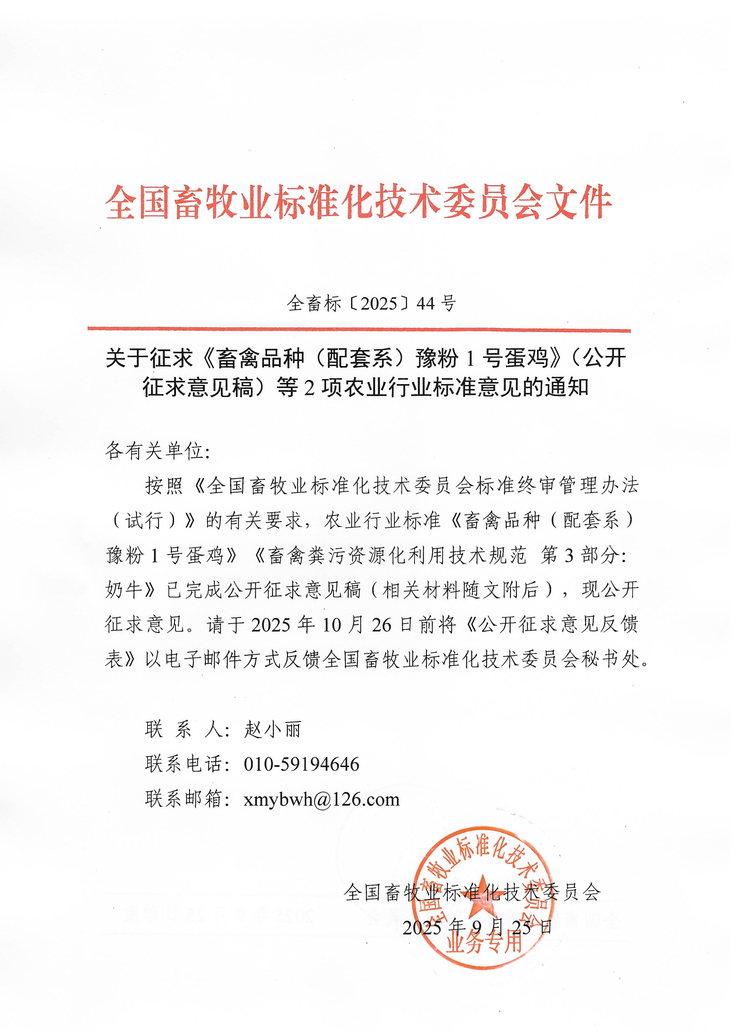 关于征求《畜禽品种(配套系) 豫粉1号蛋鸡》(公开征求意见稿)等2项农业行业标准意见的通知-999棋牌老版本