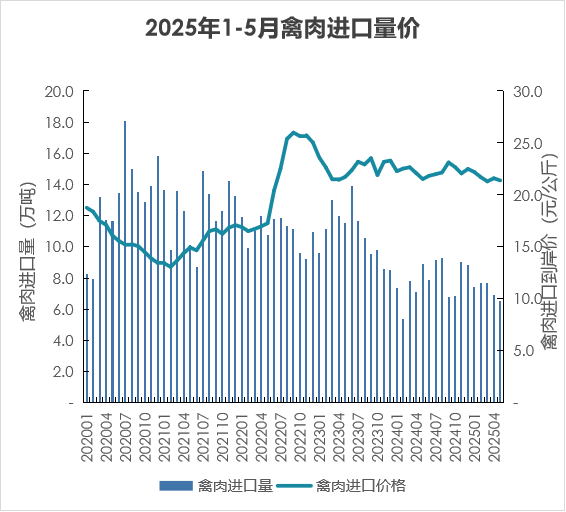 禽肉产品进口、出口均增加。1—5月,禽肉及杂碎进口36.3万吨,同比降1.3%;进口额10.8亿美元,同比降5.5%。其中,禽肉进口16.9万吨,同比增10.1%;进口额4.5亿美元,同比降1.8%。主要来自巴西、俄罗斯、泰国、美国和白俄罗斯等国,分别占进口总量的74.1%、12.3%、9.8%、1.4%和1.1%,合计占比98.8%。其中,从美国和白俄罗斯进口分别同比下降63.1%和39.5%,从巴西、俄罗斯和泰国进口分别同比增10.6%、40.9%和4.6%。1—5月禽肉及杂碎出口24.3万吨,同比增39.2%;出口额4.4亿美元,同比增17.1%;加工禽肉出口18.3万吨,同比增17.5%;出口额6.7亿美元,同比增13.0%。