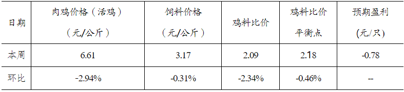 本周全国鸡料比价为2.09,环比下跌2.34%按目前价格及成本推算,未来肉鸡养殖预期亏损0.78/只。终端需求疲软,产品走货不快,屠宰企业仍维持亏损状态,收购积极性欠佳,需求面持续利空,毛鸡价格继续走低。下周终端需求延续平淡,屠宰企业库存压力大,收购积极性不足,有控量宰杀计划,预计鸡价延续下滑走势。