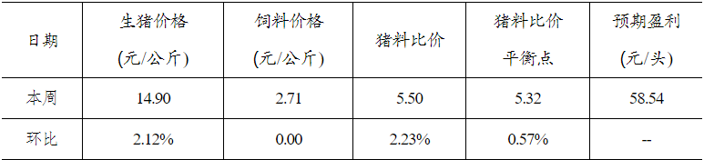 本周全国猪料比价为5.50,环比上涨2.23%按目前价格及成本推算,未来仔猪育肥模式的生猪养殖头均盈利为58.54元。本周生猪均价环比上涨。天气炎热,生猪采食量减少,生长速度放缓,集团养殖企业出栏的适重猪源供应略偏紧,叠加本周处于月底月初交接之际,养殖端出栏生猪积极性不高,供应减少支撑生猪价格涨幅增加。预计未来一周养殖端出栏积极性有所恢复,而受高温天气影响,需求端或继续保持微幅减量趋势,供增需减生猪价格可能会出现回落,但受制于生猪生长速度偏缓的影响,周内回落空间有限,周均价相对稳定,养殖预期利润保持平稳。