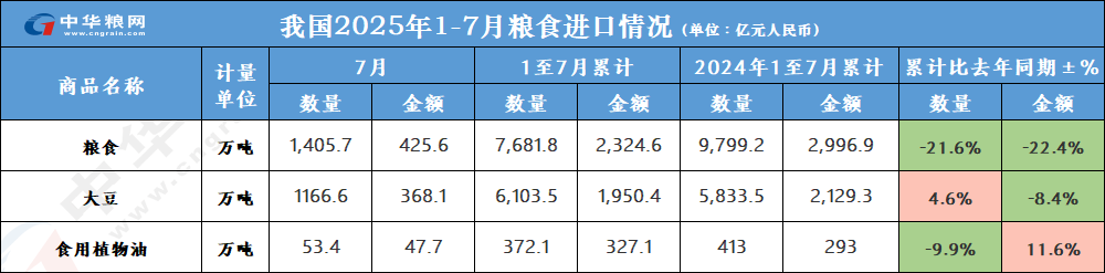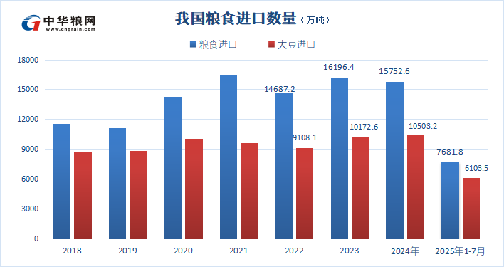 8月7日,海关总署发布最新数据:2025年1-7月我国累计进口粮食量为7681.8万吨,同比减少21.6%进口金额为2324.6亿元人民币,较去年减少22.4%。