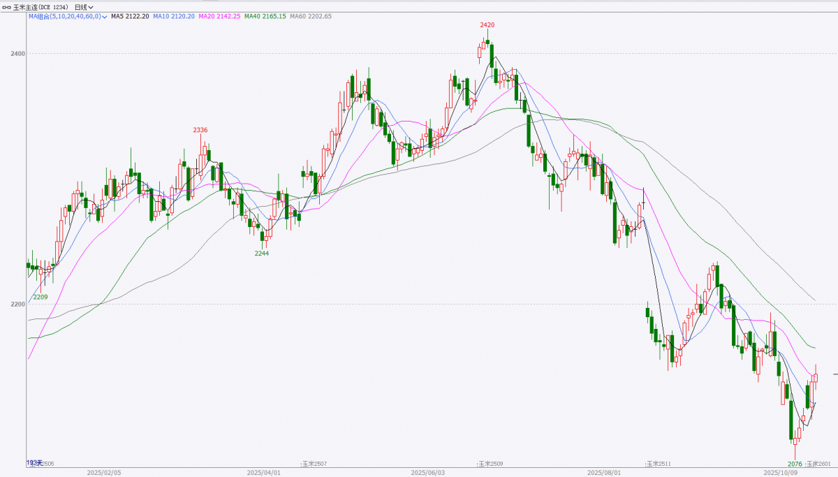 国际方面,截至2025年10月17日当周,全球玉米价格震荡回升,芝加哥玉米期货止跌反弹(周涨2.3%,为近期首次上涨),主因美国玉米出口需求稳健(尽管产量或创纪录,但中西部收获单产低于官方预期,现货基差坚挺,农户惜售),叠加市场对中美高层会晤的积极预期;周初更因大豆市场带动连涨五日,但供应充足限制涨幅。