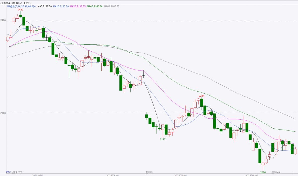 期货市场:10月29日大连玉米各合约收涨,主力c2601合约开盘2112元/吨,最高2127元/吨,收盘2123元/吨(涨6元,涨幅0.28%),持仓量增至91.2万手,资金净流入4306万元至27.12亿元。持仓显示,多头增仓13807手至607397手,空头增仓14162手至700469手,多空双方加码布局,反映当前位置博弈激烈。